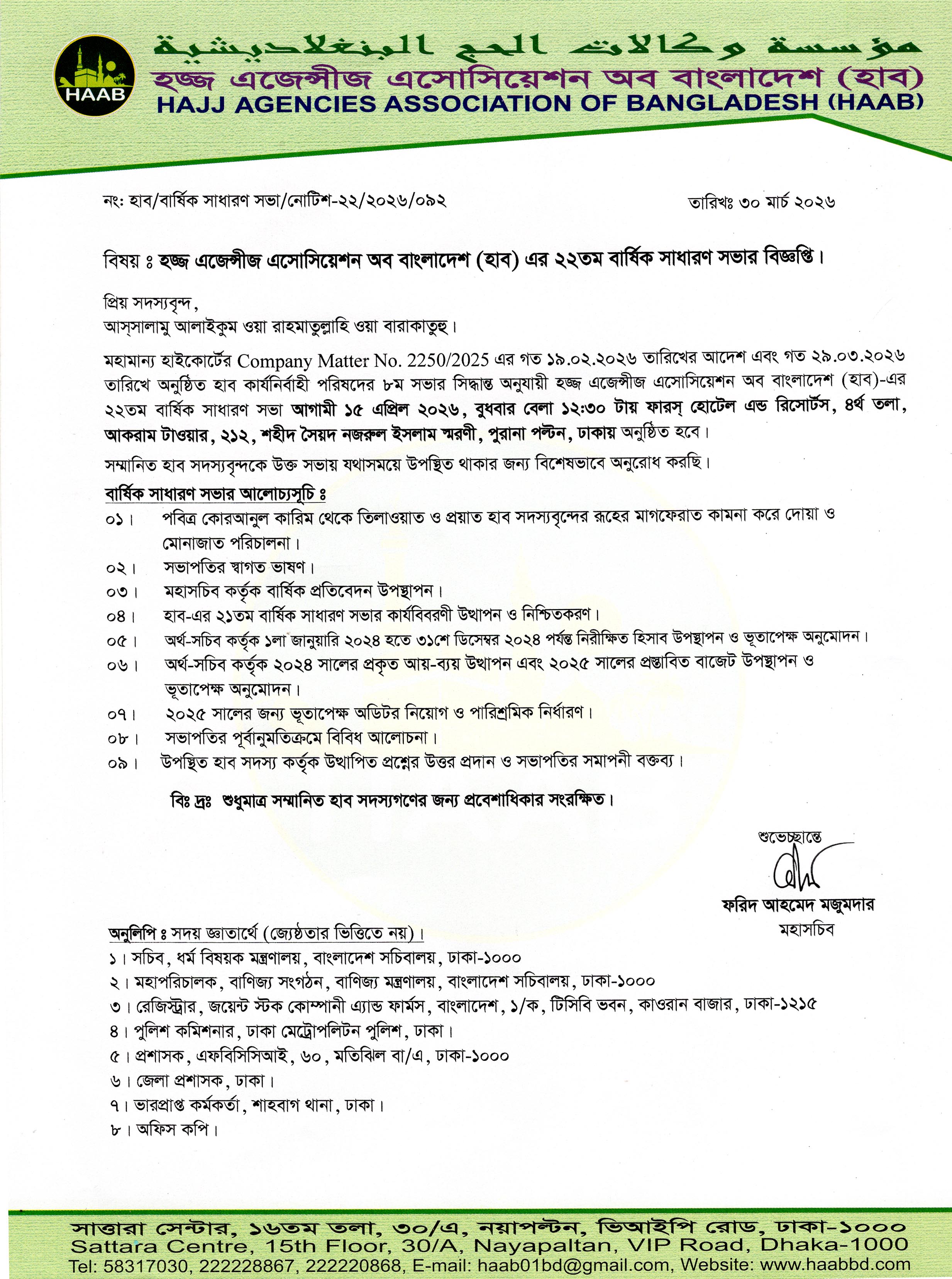 হজ্জ এজেন্সীজ এসোসিয়েশন অব বাংলাদেশ (হাব) এর ২২ তম বার্ষিক সাধারণ সভার বিজ্ঞপ্তি।